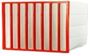 Austauschbare Filterzellen aus Mikroglaspapier mit thermoplastischen Separatoren. Die Zellen werden mit einem Nut- und Federprofil fixiert und mit einer Gummidichtung abgedichtet.